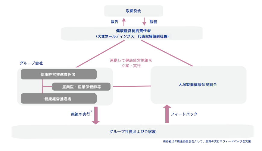 企業理念の追求には、従業員一人ひとりの心身の健康が欠かせません。そのため、大塚グループでは、健康経営統括責任者である大塚ホールディングスの代表取締役副社長のもと、大塚製薬健康保険組合、各グループ会社の健康経営推進者や産業医・産業保健師といった専門職スタッフとが連携し、組織横断で従業員やそのご家族の健康維持・増進に向けた取り組みを進めています。健康維持・増進に関する課題や、その取り組み目標・進捗に関しては、取締役会でも監督しています。